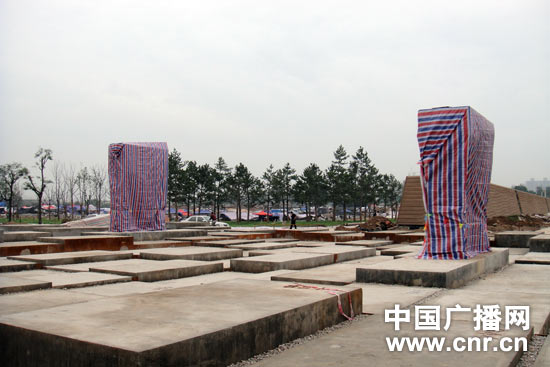 公園南面的崇明門,廣場中央立著兩個被塑料紙包起來的雕塑,透過塑料紙的縫隙可以看到,里面是鐵銹色的鋼板,鋼板中間是一面紅色的城門,紀大爺說,這種鐵銹色的鋼板是從德國進口的,這樣的雕塑本來有5個,現在拆得只剩下兩個。