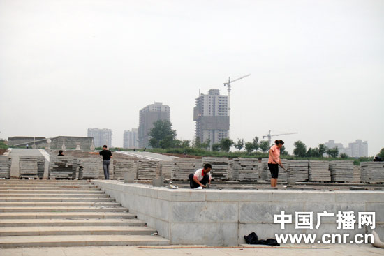 沿著太液池一路向西,在丹陛望月廣場的斜坡上,七八個建筑工人正在鋪石磚。一位姓孫的工人說,之前地上鋪的是大塊石板,鋪好后,工人又在上面雕了花紋,整體做了一朵花的造型,差不多得花了1000萬,這幾天全被揭了下來。換成了小塊的石磚。說起為什么要重新鋪小塊的石磚,這位工人笑了笑,說,前幾天來了幾位領導視察,說不好看。
