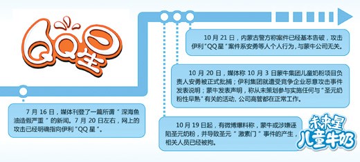 21日,內蒙古警方就有人在網絡媒體發帖損害伊利商譽案做出通報,稱案件已經基本告破,攻擊伊利“QQ星”案件系蒙牛“未來星”品牌經理安勇等人的個人行為,與蒙牛公司沒有關系。