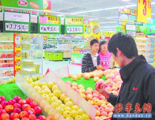 26日上午,記者走訪了家樂福、佳世客、大潤發等超市,發現質量比較好的紅富士定價全都在七元左右。“這哪是蘋果旺季啊,價格比淡季賣得都高。”不少顧客瞅瞅紅彤彤、新鮮香甜的大蘋果,再看看“價格不菲”的標價牌,望而卻步。