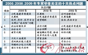 調(diào)查顯示,反腐倡廉和公民道德素質(zhì)建設(shè)依然位于專家學(xué)者關(guān)注的十大熱點(diǎn)問題前列,分列第2位和第4位。