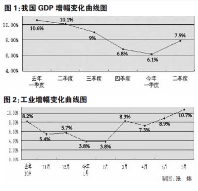 先看農業,今年全國夏糧產量達到2467億斤,比上年增長2.2%,連續6年增產。姚景源說,千萬不要小看這個夏糧“六連增”,因為近百年來,中國糧食基本上都是5年一個周期——兩豐兩平一歉。夏糧豐收為今年國民經濟平穩增長奠定了好的基礎。再看第二產業,工業增長的曲線十分清晰地描述出,去年11、12月以及今年1、2月是中國經濟最困難的4個月,目前已經是企穩向好的態勢(圖2)。最后看第三產業,保持了平穩較快增長的勢頭,上半年對國民經濟增長的貢獻率達到47.4%,比上年同期提高了6.2個百分點。