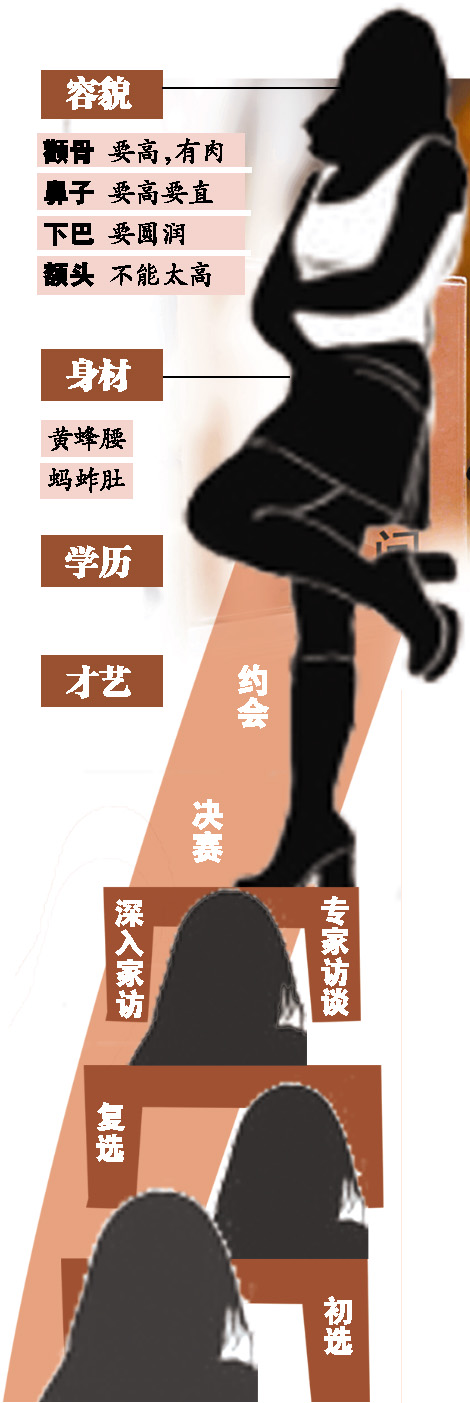 除了形象和心理測試,美女們還得過“面相關”。記者在現場看到,美女們經過一關又一關甄選后,會來到“面相顧問”的房間,接受“來自香港的相學專家”的評判。“顴骨要高,有肉;鼻子要高要直;下巴要圓潤;額頭不能太高。旺夫相大體就這個標準!边@位“相學專家”表示,如果各方面條件都優秀,但面相不符合要求,也會被淘汰出局。