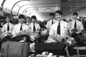 前日17時(shí)許,6名經(jīng)過(guò)美國(guó)FAA嚴(yán)格考核,已取得飛行員資格的女大學(xué)生,面帶笑容走下CA986航班,這六名平均年齡22歲的女大學(xué)生,即將加盟中國(guó)國(guó)際航空公司(下簡(jiǎn)稱國(guó)航)。據(jù)國(guó)航宣傳部門介紹,此6人是國(guó)航總部首批女飛行員。