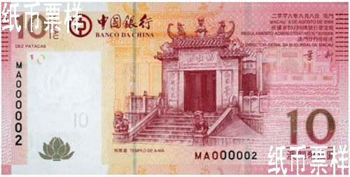 10元、20元、50元、100元、500元、1000元六種面值的主景圖案按歷史脈絡編排,分別是媽閣廟、大三巴牌坊、崗頂劇院、東望洋炮臺、鄭家大屋和民政總署大樓。鈔票背面以澳門中國銀行大廈為主景圖案,襯景選取澳門四座大橋形象,寓意澳門在中西方文化交流中和澳門元在澳門經濟發(fā)展中具有的橋梁作用。