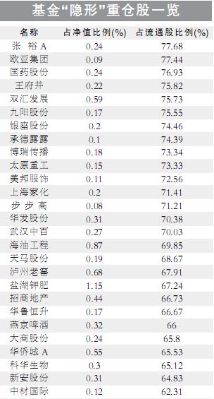 但最引人關注的,還是各基金合計持有超過上市公司流通盤70%的股票。上述股票的流通盤已經幾乎被各家基金完全瓜分,因而成為最純粹的“基金重倉股”。也就是通常所說的“基金全控盤”股票。
