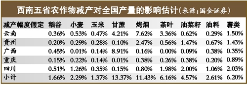 國金證券預測,西南五省甘蔗、水稻、烤煙產量在全國占比分別達78.19%、21.79%、53%,如果旱情持續,勢必導致上述農作物大幅減產。供求關系的改變,可能將推高相關農產品價格。