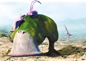食草動物像吸塵器 在霍金的宇宙中,火星、月球等類地行星上生活著兩只腳的食草動物。它們能利用吸塵器般的巨型嘴巴從巖石的縫隙中吸食食物。類地行星上還存在類似蜥蜴的食肉動物,雙方偶爾爆發(fā)獵食大戰(zhàn)。