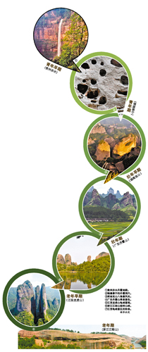 “中國丹霞”項目提名地包括廣東丹霞山、貴州赤水、福建泰寧、湖南崀山、江西龍虎山、浙江江郎山等6個省的6處國家級風景名勝區,它們分別代表了丹霞地貌從青年、壯年向老年演化的典型過程,構成了一個不同發育階段和不同景觀類型的完整系列,具有全球意義和突出普遍價值。
