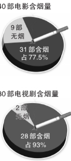 從2007年開始,中國控?zé)焻f(xié)會(huì)每年都會(huì)對熱播的國產(chǎn)影視劇中的吸煙鏡頭進(jìn)行監(jiān)測統(tǒng)計(jì)。對2009年熱播的40部電影和30部電視劇進(jìn)行的監(jiān)測結(jié)果顯示:在40部電影中有9部電影完全沒有煙草鏡頭,31部影片有煙草鏡頭,占影片的77.5%;30部電視劇中,2部沒有煙草鏡頭,28部有煙草鏡頭,占電視劇比例的93%。