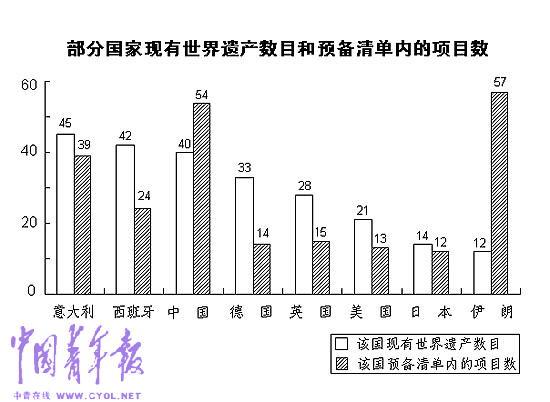 在“世界遺產委員會”公布的總共1494處的遺產預備清單中,只有伊朗(57處)多于我國。較早開始“申遺”的英國只有15處,且都是1999年之前就遞交的清單。相對例外的是美國,預備清單上的13處項目都是2008年遞交的,但近5年來美國只有1處新增項目被《世界遺產名錄》收錄。