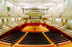 在公共空間的另一側,是設計獨特的戲劇場。戲劇場共計有1035個席位,具有濃郁民族色彩的絲布墻面體現出戲劇場親切、熱烈而傳統的氣氛,平時主要以戲曲、話劇演出為主。劇場內設置的“鼓筒式”轉臺是根據德累斯頓歌劇院和英國皇家芭蕾舞劇院的舞臺組合出的新型轉臺,可以達到15塊臺邊移動、邊升降、邊旋轉的舞臺效果———演出話劇《江姐》的時候,只消升起兩塊臺板構成一個立體矩形,前邊再放上一只火盆,就構造出渣滓洞監獄的陰森場景;如果把這些臺板漸次升起,就是可供合唱團站立的標準性臺階;如果把臺板按需要升起后再進行圓臺旋轉,那么戲劇導演可以在數個舞臺場景瞬間切換。