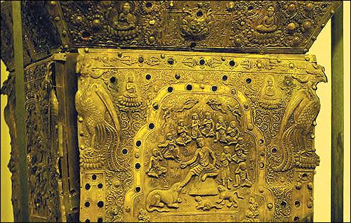 記者了解到,塔王被請出后的第一件事就是“擦澡”,專家用蒸餾水、棉花在塔王的表面一點點地擦洗,如今,凡是見過它的專家都會驚艷,去除蒙塵的塔王散發出金色的光澤,表面布滿了大大小小的雕刻圖案,如果加上20多幅故事圖畫上的人物,阿育王塔佛像人物像共超過了100個,舉世罕見。其中,佛祖釋迦牟尼生平故事以連環畫的形式雕刻在8片山花蕉葉上,每片上有2-3個故事,共約20幅圖案分別描述了六牙白象入夢、佛祖誕生、菩提樹下證道、佛祖涅槃等20個故事。