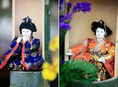 送完禮物,枝子回到家中,從自己的臥室里拿出好多偶人,擺放在偶人架上。這是她歷年珍藏的。在日本,每年過“女兒節”的時候,父母和親朋都會送一些偶人給女孩子。女孩們會將歷年得到的小偶人都珍藏起來,過節這天再把它們搬出來,和自己一起歡度節日,直到出嫁時再將它們帶走。此時,枝子的母親也將米酒、粽子、紅白綠三層菱形餅等和玩偶一起陳列在客廳里,家中節日的氣氛更濃了。中午,枝子邀來5位自己最親密的女友,我們一起圍坐在偶人架前,聽著舒緩的音樂,盡情地吃喝、說笑、玩耍。枝子的父親給我們每人發了一些小米糕,祝賀女孩們“越來越高”,健康漂亮。然后,大家在歡快的《偶人快樂》歌聲中,切開了為節日特訂的比薩餅。