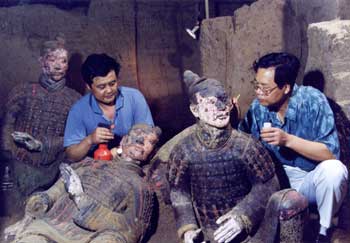 在整個修復過程中,11位工作人員集中人力,打破機械的分工,利用舊鐵釘、廢鋸條充當工具完成了陶塊的初步清潔工作;采用殘磚、破瓦試驗黏接效果:黏接小塊時利用木箱、砂土作固定器,拼接大塊時則用麻繩、木棍絞緊捆牢。為了使修整復原后的兵馬俑保持原樣不走形,要保證每一黏接處都嚴絲合縫。兵馬俑的碎塊多,不可能一次全部黏接好,必須由小拼大、由腳到頭逐步黏接……最終耗時28天,工作人員完成修復任務。