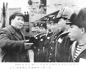 當時跟著毛主席一起來視察的有公安部長羅瑞卿、華東軍區司令員陳毅、參謀長張愛萍。毛主席身著土黃色的風衣,在蒙蒙的細雨中,面帶微笑,他和所有同志握手,并且都問了姓名、職務。“第六艦隊劉司令向主席介紹了我,主席問我,‘噢,我看你很年輕嘛,你多大歲數?’我的心怦怦地直跳,慌亂地回答說,‘43’。話剛出口,我立刻覺得不對了,趕快改口說:‘不對,33’。”
