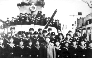 在艦上,毛主席看望了戰士們以后,便到了后主炮“130”大炮的前面看操演。馮尚賢開始指揮來這里接受檢閱的艦艇,毛主席看了很滿意。之后,一行人就到了會議室。