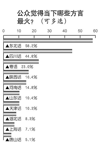 公眾覺得當下哪些方言最火?調查中,58.2%的人首選東北話,四川話以44.8%的支持率排名第二,23.0%的人選擇了粵語,排第三。接下來還有陜西話(16.4%)、河南話(14.8%)、山東話(10.4%)、天津話(10.3%)、湖北話(8.3%)、上海話(7.1%)、唐山話(5.1%)等。