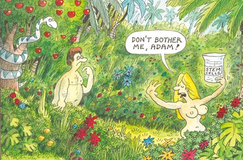 7月9 日,英國《太陽報》登出一張漫畫,在漫畫中,置身于伊甸園中的夏娃手持一只貼著“干細胞”標簽的燒杯,一臉傲慢地說:“亞當,請別煩我!”對事件的中心人物納伊尼亞教授而言,倫理上的質疑和爭議似乎并沒有給他帶來什么困擾。他認為此項研究可以為那些想要孩子卻沒有能力的家庭帶去福音,而爭議則“完全可以通過法律最后進行規約”。面對紛至沓來的媒體,納伊尼亞教授仍沉浸在實驗成功所帶來的興奮之中:“這太令人興奮了!這些人造的精子有頭,有尾巴,也可以移動,它們具備能夠產生生命的一切特質!”