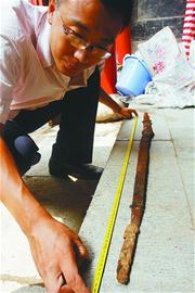 這次出土的幾件鐵器也引起了李銘的興趣。他告訴記者,別小看了這些鐵器,在漢代,這樣的鐵器屬于高檔品,不是一般人能用 的,更不是一般人能享受這樣的陪葬品的。這次出土的鐵器最重要的有3件。第一件是一柄鐵劍,已經斷裂為5截,經拼接后測量,其長大約1.15米。雖然劍體 銹蝕嚴重,但依然能看出質地優良,制作講究。劍柄的造型還基本清晰,劍箍為青銅制作。從這柄劍上,我們可以推斷很多當時的情況,如劍長1.15米,比現在 一般的劍要長,這就說明使用這柄劍的人身材比較高大;根據劍的形制,可初步認定是濟南當地制作,如果通過科技手段研究出劍的鐵質及其他合金含量,這對研究 漢代時期濟南地區的冶煉史有重要的參考價值。再說鐵鼎和鐵釜,它們都是漢代時期的生活用具。其中,鐵鼎為雙耳三足折腹鼎,形狀很好。雖然現在看銹蝕嚴重, 但在當時不是一般人家能夠使用的,不是官員,至少也是大戶人家,所以這對研究當時的社會生活和陪葬習俗都有重要價值。
