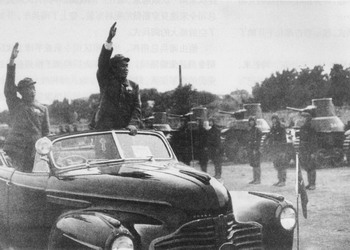毛澤東等“五大書記”身穿解放區那種厚厚的棉褲、胖胖的棉鞋、羊毛外露的大衣,乘坐一輛美國造的老道吉防彈車,檢閱了整裝肅立的一個步兵師、一個炮兵師、一個裝甲兵師,大約3萬余人,還有穿著各式各樣服裝的北平市工、農、商、學各界代表和各民主黨派、人民團體、無黨派民主人士。其中包括為和平解放北平古都作出貢獻的傅作義將軍。