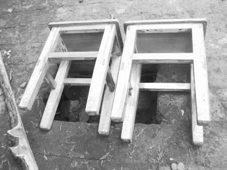 該“地洞”位于景區碑座南約20米處,神道的東側。洞口長約40厘米,寬約20厘米,目前,四周已被一條鐵鏈圈住,一個“小心地滑”的警示牌放在一旁,兩把椅子橫在洞口。透過縫隙向下看,該洞呈圓形,洞底距離地面約有50厘米,里面有一些雜物,洞口周圍的青磚,也出現了松動跡象。