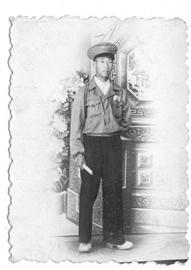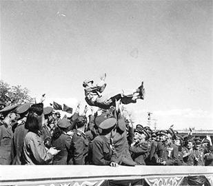 閱兵結束后,張百川跟同學們紛紛跑到照相館拍照留念。大家都穿著閱兵時的裝束:為閱兵專門配發(fā)的綠色飛行員帽子、上衣,白色襯衣,腳上穿著咖啡色的仿毛皮鞋。張百川介紹說,原本發(fā)的是普通的軍用膠鞋,為了踢正步時鏗鏘有力,特意發(fā)放了這樣的皮鞋,據(jù)說是抗日時繳獲日軍的。