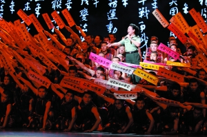 昨日的演出現場首次讓媒體先睹為快。從現場看,此次人民大會堂的舞臺已改造成上下兩層,并以巨大的環形階梯形式從高處過渡到地面,中間的背景大屏幕則一直在播放與每個段落有關的多媒體影像。大量的光影投射和強大音響效果的配合,營造出了十分震撼的舞臺效果。
