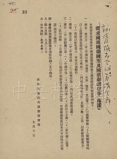 1949年檔案:第28集 新政協籌備會第六小組決定公開征求國旗國徽圖案及國歌詞譜