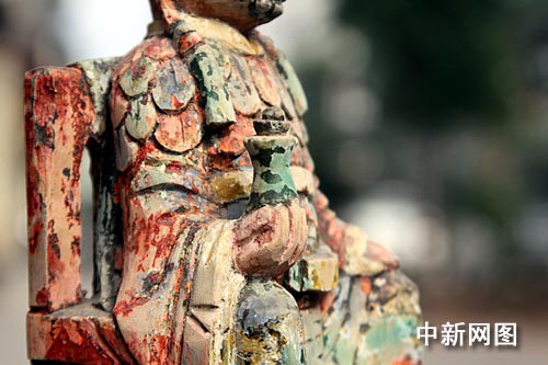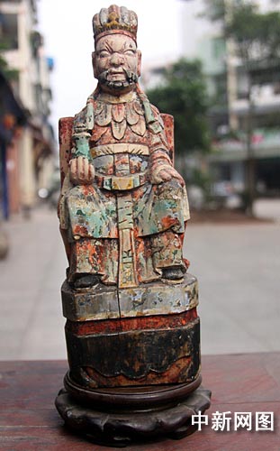 中新網成都9月28日電(劉龍泉)9月28日,記者在四川長寧縣城“永勝收藏館”里看到了一尊“酒圣公”木雕神像。該神像用柏木雕成,寬11厘米,相高22厘米,連座高30厘米;神像為男性,坐在太師椅上,頭戴孔明帽,眼睛大而突出,胡須濃密,一副文武兼備的樣子。他的左手放在左大腿上,右手則向上持有一酒瓶,酒瓶上蓋有木塞。
