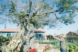 記者轉頭望去,金色的陽光灑滿綠色的庭院,庭院中央,一棵四人合抱的大槐樹矗立著,盡管近一半的樹干被燒毀,但另一半仍然枝繁葉茂,給庭院提供一片滋潤的樹陰。那位村民說,這棵神樹遭雷劈過,不過,神樹數次逢兇化吉。