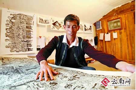 11月13日,記者前往采訪時,農民版畫家盧正林在自己的版畫工作室翻閱資料,為構思新作做著準備。“沒有想到,我們壯族農民創作的20幅版畫能被外交部選定為國禮,胡錦濤主席出訪時以個人名義贈予意大利國家領導人。”盧正林一臉興奮。