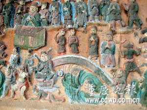 長壽區但渡鎮未名村龍溪河邊的一塊懸崖峭壁上,雕刻著100個形形色色的人物,不僅有黑白無常、牛頭馬面等諸多冥界人物,圖畫還繪聲繪色地展示著,死去的人們魂魄過奈何橋、做惡者上刀山、下火海遭受種種酷刑的場景。