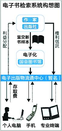 網絡收費圖書檢索的構想源自長尾真館長發表于2008年4月的一項個人設想,該設想最大的亮點便是設立非盈利的第三方機構“電子出版物流通中心”,全面負責與作家的作品網絡發布有關的著作權問題。國會圖書館將藏書的電子數據無償提供給“電子出版物流通中心”,由該中心以收費方式發送給使用者,隨后將征收到的電子書存取費分配給著作權人。據悉,該中心的功能非常近似于眼下“日本音樂著作權協會”受詞曲作者委托,向電視臺等征收著作權使用費。
