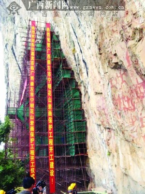 昨日上午,在簡短而隆重的開工儀式后,廣西崇左市寧明花山巖畫保護工程正式開工。花山巖畫保護前期工作長達18年,僅在方案研究、材料試驗和方案設計等工作上就耗時5年,其所動用的學科領域和專家之廣、所耗資金之多,不僅在廣西文物保護史上史無前例,就是在中國文物保護史上也極為罕見,而此次開工的第一期搶救性加固工程被專家稱為“要干救命的活”。那么等著“救命”的花山巖畫其病害危重到什么程度?為什么前期工作要花費那么長時間?一期保護工程將使用哪些先進技術?我們以后還能不能看到它的原貌?記者在保護工程現場進行了采訪。