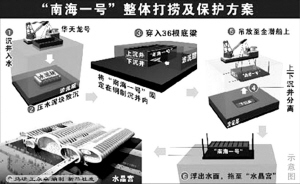 經過多次論證,專家們比較傾向采用“沉箱式”整體打撈方案,即用鋼板將沉船整體包住,再用鋼釬從船底穿過,潛水員在海底進行打鉚和焊接,最后將沉船整體打撈出水。整體打撈首先必須要把沉箱壓到海底扣住整條船,如果扣不住就沒有辦法穿底梁,底部不封閉,不可能打撈。水下考古中心隊員魏俊說:“在這個過程中,我們又遇到了一些難題:第一個沉箱下壓,需要多大的壓力,才能到位?第二,壓下去之后,淤泥沒有了,只有海水,這樣會不會使原有的船由于周圍環境的改變而遭到損壞;第三,這個箱子封閉以后怎么把它吊起來?”