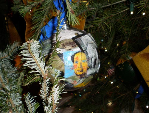 據12月25日出版的《環球時報》報道,在奧巴馬入主白宮的首個圣誕節,擺放在白宮藍廳中央的一棵圣誕樹,引起外界的強烈興趣。這棵圣誕樹由奧巴馬夫人米歇爾親自“裝扮”,上面懸掛了中國領袖毛澤東頭像的裝飾。