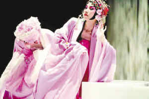 《中國制造——游園驚夢》中,金星把自己大而化之了,將更多的動作交給了群舞演員,自己卻在口唱昆曲的女旦后面,如同影子一樣重復(fù)相同的圓場動作。一前一后,兩個杜麗娘,當(dāng)然可以看作形式上的設(shè)計,但金星不會做一個簡單的決定。衣飾更為亮麗的女旦交錯了杜麗娘的身份和創(chuàng)作者自己的心聲,她是一個站在前臺的代言體,作品真正的主角則處在后面更為安全的位置上裊娜如煙。《中國制造——游園驚夢》可以看作是對《貴妃醉“久”》的延伸,借戲曲女旦代言,使作品充滿了傳統(tǒng)與現(xiàn)代社會的錯亂,但社會性的時間對于癡人來說,從心理上是不存在的,在自我的世界中,只有性別的錯亂、情感的矛盾和心理的惶恐。電影《霸王別姬》中,程蝶衣就是這樣一種人物。