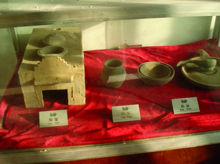 進入3間墓室,中間墓室的最下層鋪有一指多厚的木炭灰,往上一層鋪著豆粒大小的朱砂,再往上一層是用云母片剪成的日月星形的圖案,云母片上是骨殖,大體骨殖都有,比較完整的有28節,惟缺頭蓋骨。墓中還出土了全套灰陶制作的灶具,另有陶井、陶雞、陶鴨、陶狗、陶鵝等。