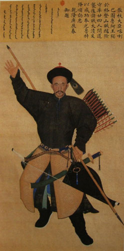 畫作的左上角注明滿文和漢文題贊:“頭等侍衛固勇巴圖魯伊薩穆,援兵雖來,畫塹相望,孰騎而呼,為告無恙,維巴圖魯,偕往趣師,其沖賊隊,如分水犀”——勇士的英名、事跡也和勇士的肖像一起懸掛朝堂,詔告天下,永存美譽了。