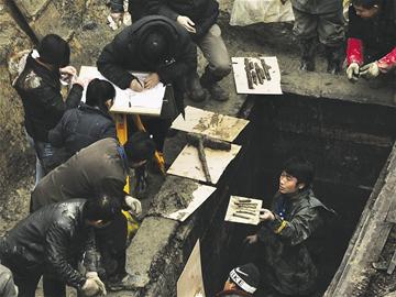 昨日上午10時(shí)許,工作人員從槨室內(nèi)的淤泥中清理出幾片器物,吸引了眾人的目光。經(jīng)現(xiàn)場(chǎng)考古專家證實(shí),這是兩枚珍貴的竹簡(jiǎn),由于年代久遠(yuǎn),墓室內(nèi)的結(jié)構(gòu)和環(huán)境又遭破壞,竹簡(jiǎn)異常脆弱。工作人員隨即將竹簡(jiǎn)嚴(yán)密包裹起來(lái)。由于槨室內(nèi)的淤泥和積水較多,竹簡(jiǎn)的數(shù)量和簡(jiǎn)上文字內(nèi)容尚不得而知。