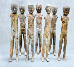 在M8的周圍,考古專家先后發現6座大小不一的陪葬坑。揭開一座座陪葬坑,驚現“千軍戰俑”,有陶俑、木俑。正在發掘的k6號坑內,數以萬計的陶俑雖倒在坑內,卻個個精神抖擻,面部清晰,紅紅的嘴唇,濃黑的眉毛,還有著各種發式,有的神情凝重,有的面容祥和!半m然陶俑這么多,卻很難找到同樣的臉。”史全平說。