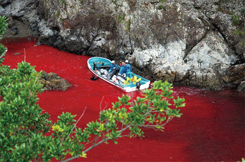 受到驚嚇的海豚在海灣凹口內四處游竄,周圍的海水已被海豚的血水染成紅色。有些母海豚為了告知幼海豚有危險并試圖保護它們時,往往發出極度痛苦的鳴叫。絕望的叫聲加上觸目驚心的血水,讓這一幕顯得即凄慘又血腥。