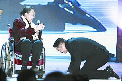 被譽(yù)為2010中國第一史詩巨片的《孔子》,1月中旬在北京舉行首映慶典,慶典上孔子的第77代嫡孫女孔德懋女士坐著輪椅上臺,周潤發(fā)便一直在旁邊像子侄一樣跪著聽老太太講話。孔德懋女士盛贊周潤發(fā)在電影《孔子》中飾演孔子的精彩表演,并將寫有“永遠(yuǎn)的孔子”的橫幅贈送給發(fā)哥。這時(shí),周潤發(fā)出人意料地向孔女士認(rèn)真雙膝跪地叩首,隨后,與孔女士溫情擁抱,場面令人動容……