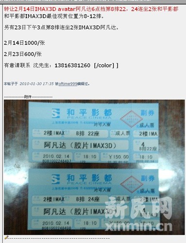 2月14日阿凡達(dá)IMAX票已炒至1000元!和平影都2月影票自1月29日開(kāi)售起,便掀起新一輪購(gòu)票狂潮。新民網(wǎng)記者近日在各大論壇及購(gòu)物網(wǎng)站上看到,2月份影票大多已飆至500元,2月14日晚6點(diǎn)場(chǎng)次已炒至1000元。對(duì)此,和平影都總經(jīng)理王伯政表示:“‘黃牛’不得了,這也不是我能管的。”