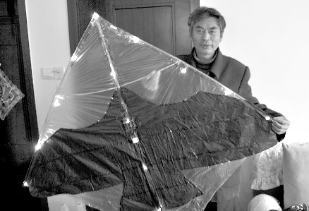 昨日下午2時許,在東坡路靠近清水河的一塊空地上,一只黑色的風箏正在天空中翱翔。在不遠處,一位身著黑衣的白發老人正拿著絞盤,不斷地放線收線,其他幾位老人則抬著頭議論紛紛。放風箏的老人名叫戚勉休,今年69歲,而他就是前晚放飛發光風箏的人。