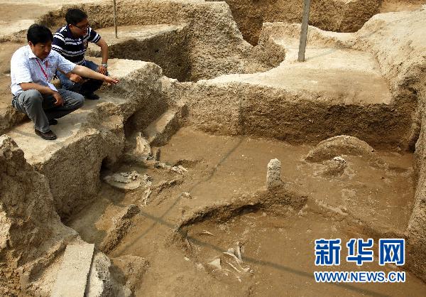 這是6月6日拍攝的洛陽市林校西周洛邑祭祀遺址的人馬組合坑。當日,河南洛陽市文物局組織專家對洛陽市林校西周洛邑祭祀遺址考古發(fā)現(xiàn)進行研討并向媒體發(fā)布了發(fā)掘成果。這處遺址西距瀍河約1公里,西北距北窯西周墓地及西周鑄銅遺址約4公里,總發(fā)掘面積為945平方米,于2009年2月開始發(fā)掘。考古人員在洛陽市林校工地共發(fā)現(xiàn)西周灰坑59座、流水溝1條、墓葬14座以及唐代灰坑42座,其中31座西周祭祀坑的發(fā)現(xiàn)是本次發(fā)掘的重要收獲,為尋找西周洛邑城址提供了又一重要線索。新華社發(fā)(張曉理 攝)
