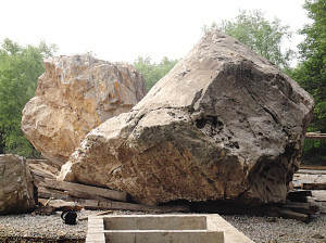 或許是巨石過于沉重,巨石下墊放的粗壯枕木有的都被壓斷,平臺面上還被砸出大小不等的坑,可見巨石落地時的巨大壓力。四塊巨石相鄰而放,在最小的一塊石頭上,還留有一根纜繩,足有成人手臂粗。焦山碑林碑刻博物館館長丁超告訴記者,四塊巨石的出水時間分別在10日、15日和19日三天。盡管4日打撈一塊巨石出水時出現碎裂,但經專家們分析后,還是決定按照原計劃打撈,即通過潛水江底沖淤后給巨石穿高強度尼龍纜繩起吊。