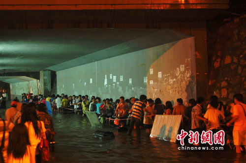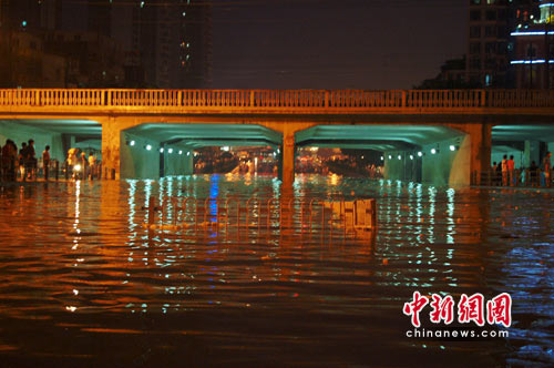 13日晚9時左右,記者來到武漢市江漢區新華下路沿線,人行道上漬水已達30厘米左右。其中,5米高的鐵路橋涵洞被淹去近半,最深積水處超過2米,整條道路交通基本癱瘓。許多市民在經過此路段時,不得不卷起褲腳、提著鞋子涉水通過。
