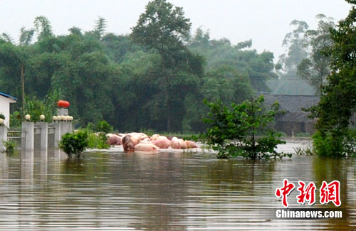 18日早上,中新網(wǎng)記者在受災(zāi)嚴(yán)重的重慶潼南柏梓鎮(zhèn)看到,雖然雨已經(jīng)停歇,但鎮(zhèn)上的洪水仍未褪去,多條街道的積水仍有半人深。洪水完全包圍了當(dāng)?shù)氐囊粋(gè)養(yǎng)豬場(chǎng),近百頭被淹的活豬成片浮在水面上,據(jù)該場(chǎng)工作人員介紹,該豬場(chǎng)養(yǎng)的6000多頭豬均被洪水淹沒(méi),僅17日便死了1000多頭豬。因豬場(chǎng)受困之處水位較深無(wú)法救援,豬場(chǎng)場(chǎng)主只能眼睜睜看著豬被洪水沖擊漂浮。